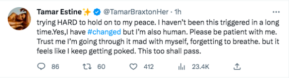 “trying HARD to hold on to my peace. I haven’t been this triggered in a long time.Yes,I have #changed but I’m also human. Please be patient with me. Trust me I’m going through it mad with myself, forgetting to breathe. but it feels like I keep getting poked. This too shall pass.”