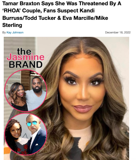 During the show, Tamar revealed that she was referring to Kandi Burruss and Todd Tucker when she previously alleged that a reality star and her husband tried to fight her. At the time, it was speculated that the Braxton sister was either referring to Burruss, Eva Marcille, or Drew Sidora. However, Tamar recently made it perfectly clear that it was, in fact, Kandi and Todd who attempted to get into a physical altercation with her.
