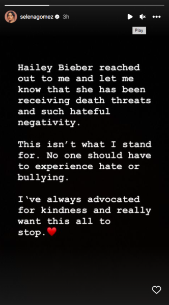 Unfortunately, it seems that those hate comments have entered into a whole other level of scary and Hailey is now receiving death threats from Selena’s fanbase. Earlier today (Mar. 24) the former Disney star shared a statement via her IG stories and let her Selenators know that “hateful negativity” is something she won’t stand for. She wrote,