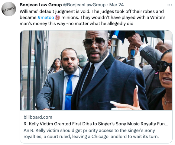 “Williams’ default judgment is void. The judges took off their robes and became #metoo minions. They wouldn’t have played with a White’s man’s money this way -no matter what he allegedly did”