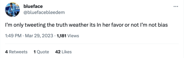 “I’m only tweeting the truth whether its In her favor or not I’m not bias.”