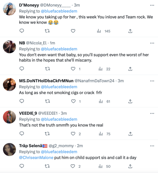 Users tagged the controversial artists’ girlfriend advising that she put him on child support. Some also claimed he’s in support of Chrisean Rock’s bad habits in hopes that she’ll miscarry.