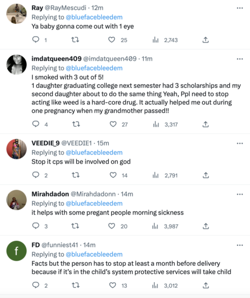 “Lots of women smoke weed until their last trimester there is no effect don’t shoot the messenger.”