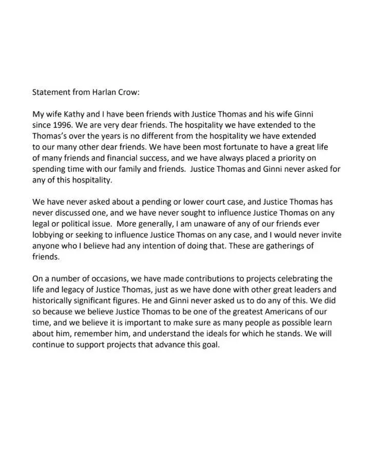 “My wife Kathy and I have been friends with Justice Thomas and his wife Ginni since 1996. We are very dear friends. The hospitality we have extended to the Thomas’s over the years is no different fro the hospitality we have extended to our many other dear friends.”