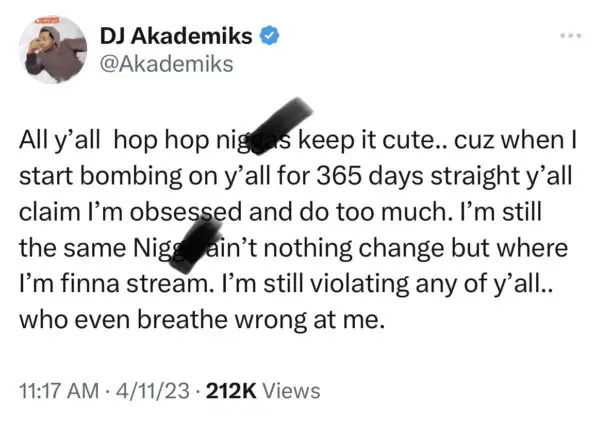 “All y’all hop hop ni**as keep it cute.. cuz when I start bombing on y’all for 365 days straight y’all claim I’m obsessed and do too much. I’m still the same Ni**a ain’t nothing change but where I’m finna stream. I’m still violating any of y’all.. who even breathe wrong at me.”