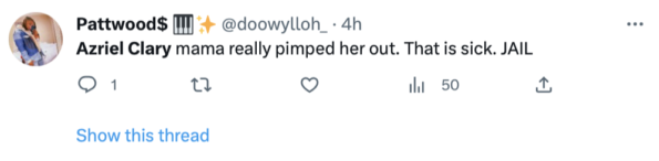 Azriel Clary has seemingly responded to the serious allegations that her mother “pimped her out” to R. Kelly when she was a minor.