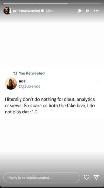 “I literally don’t do nothing for clout, analytics or views. So spare us both the fake love, I do not play dat sh*t”