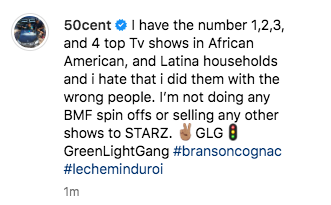 “I have the number 1,2,3, and 4 top Tv shows in African American, and Latina households and i hate that i did them with the wrong people. I’m not doing any BMF spin offs or selling any other shows to STARZ. “