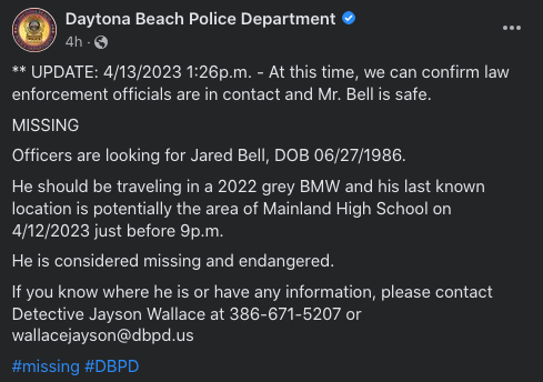 Officers are looking for Jared Bell, DOB 06/27/1986.He should be traveling in a 2022 grey BMW and his last known location is potentially the area of Mainland High School on 4/12/2023 just before 9p.m.He is considered missing and endangered.”