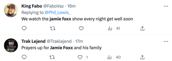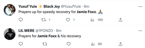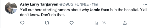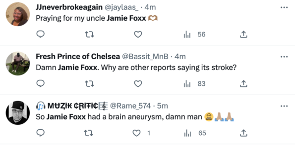 After learning about Jamie’s health issues, social media users flooded Twitter with theories about what the entertainer could possibly be recovering from. Outside of wondering if he suffered a stroke or brain aneurysm, fans sent their prayers and well wishes to Jamie and his family.