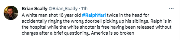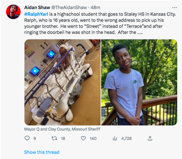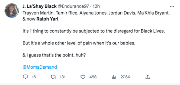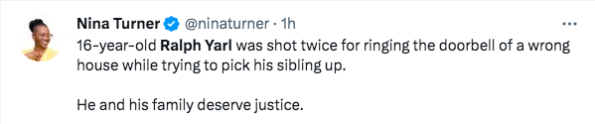 “His name is #RalphYarl and I’m sick and tired of this feeling…my heart completely broke when I learned this precious 16-year-old, who accidentally rang the door of the wrong address in an attempt to pick up his siblings, was shot in the head by a man who didn’t want him on his property.