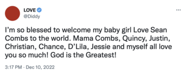 “I’m so blessed to welcome my baby girl Love Sean Combs to the world. Mama Combs, Quincy, Justin, Christian, Chance, D’Lila, Jessie and myself all love you so much! God is the Greatest!”