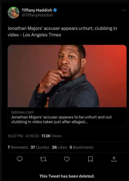 The Girls Trip actress was trending on Twitter for a recent post that she made. In a post and delete, Tiffany Haddish shared an article about Jonathan Majors and how his alleged victim was spotted out clubbing and was seemingly unhurt.