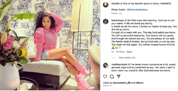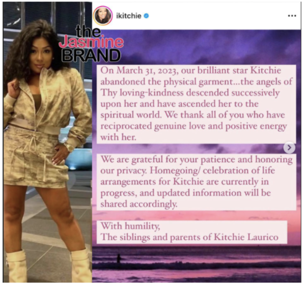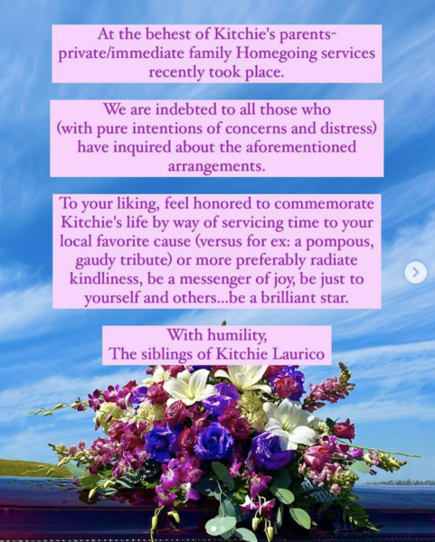“At the behest of Kitchie’s parents-private/immediate family homegoing services recently took place.”