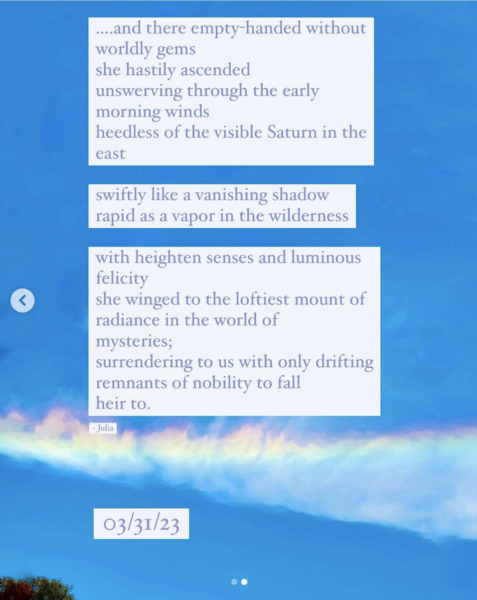 “…And there empty-handed without worldly gems she hastily ascended unswearving through the early morning winds heedless of the visible Saturn in the east. Swiftly like a vanishing shadow rapid as a vapor in the wilderness. With heighten senses and luminous felicity she winged to the loftiest mount of radiance in the world of mysteries; surrendering to us with only drifting remnant of nobility to hier to.”