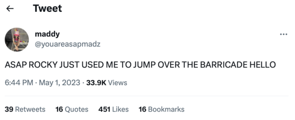 “ASAP ROCKY JUST USED ME TO JUMP OVER THE BARRICADE HELLO.”