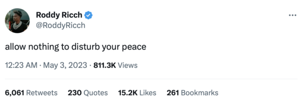 Reportedly, the “Ballin” rapper hired attorney Samantha Spector in hopes of getting him out of the ongoing legal drama. Despite the allegations he’s facing, Roddy is seemingly remaining positive through it all. On Wednesday (May 3), the Compton native — who hasn’t posted on the bird app for almost two months — took to Twitter and wrote: