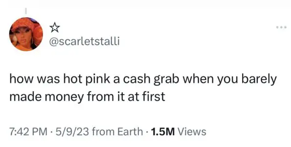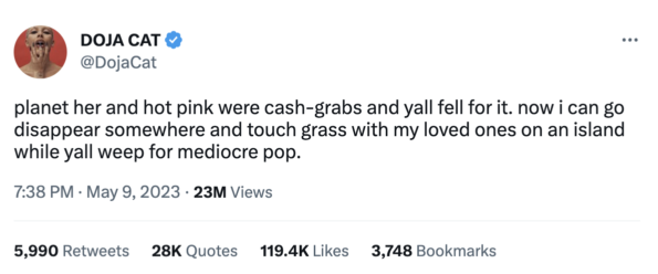 “Planet her and hot pink were cash-grabs and yall fell for it. now i can go disappear somewhere and touch grass with my loved ones on an island while yall weep for mediocre pop.”