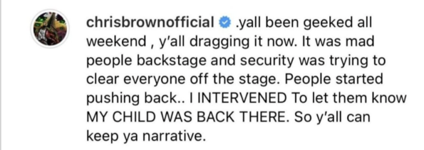 “Y’all been geeked all weekend, y’all dragging it now. It was mad people backstage and security was trying to clear everyone off the stage. People started pushing back.. I INTERVENED to let them know MY CHILD WAS BACK THERE. So y’all can keep ya narrative.”