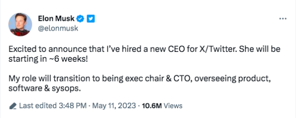 “Excited to announce that I’ve hired a new CEO for X/Twitter. She will be starting in ~6 weeks!