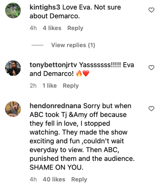 “Sorry but when ABC took Tj &Amy off because they fell in love, I stopped watching. They made the show exciting and fun ,couldn’t wait everyday to view. Then ABC, punished them and the audience. SHAME ON YOU.”