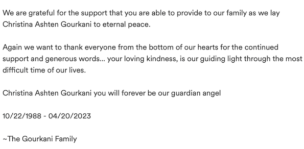 Christina Ashten Gourkani’s family laid her to rest on May 4. Her loved ones also shared details about her death via the GoFundMe page that was created to help raise funds for funeral expenses.