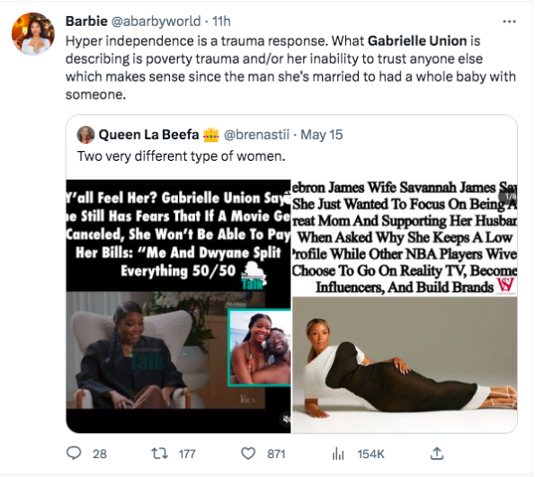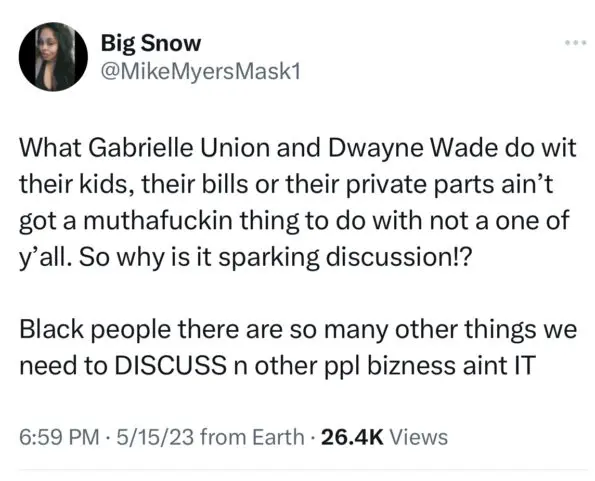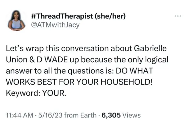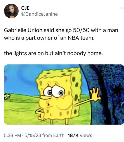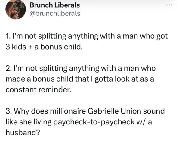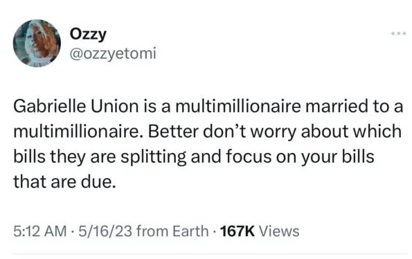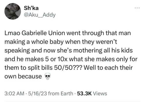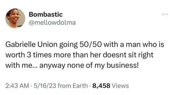 “Gabrielle Union going 50/50 with a man who is worth 3 times more than her doesn’t sit right with me…anyways none of my business.”