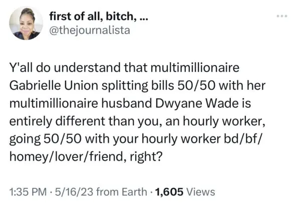 “Gabrielle Union is trending because she said she splits the bills 50/50 with Dwyane Wade. I can’t think of a bigger waste of time than worrying about how married people handle their finances, especially if you’re single.”