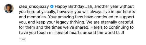 “Happy Birthday Jah, another year without you here physically, however you will always live in our hearts and memories. Your amazing fans have continued to support you, and keep your legacy thriving. We are eternally grateful for them and the times we’ve shared. Here’s to continuing to have you touch millions of hearts around the world LLJ!”