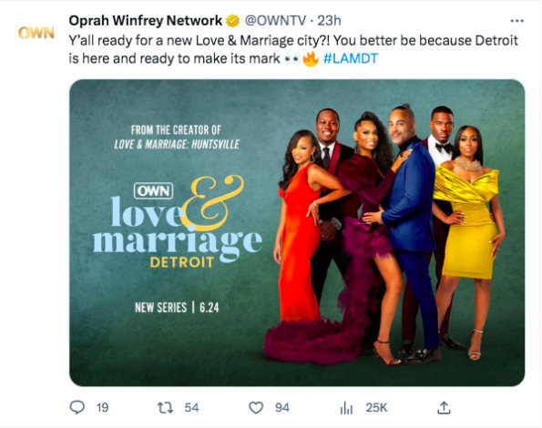 Reality TV fans will have another show to add to their watch list this summer! On Wednesday (May 17), during Warner Bros. Discovery’s 2023 Upfront presentation, it was announced that “Love & Marriage: Detroit” will be coming to your TV screens soon. The series is set to premiere on June 24 on Oprah Winfrey’s OWN network. As you may already know, the “Love & Marriage” franchise typically follows prominent Black couples and singles living within a thriving city as they share the ins and outs of their personal lives.