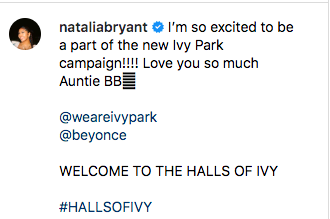 “I’m so excited to be a part of the new Ivy Park campaign!!!! Love you so much Auntie BB”