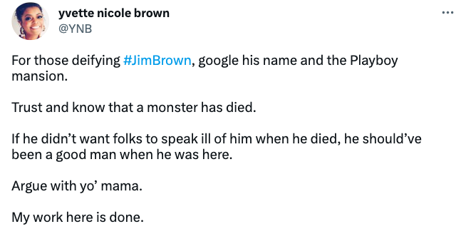 “For those deifying #JimBrown, google his name and the Playboy mansion. Trust and know that a monster has died. If he didn’t want folks to speak ill of him when he died, he should’ve been a good man when he was here. Argue with yo’ mama. My work here is done.”