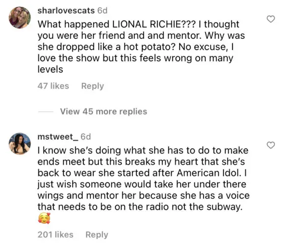 “I have people who are helping me. I’m putting out music when I can and when it’s ready. It’s just hard because I’m coming out of pocket and I have bills to pay. And American Idol is not going to pay my bills. Lionel Richie’s not going to pay my bills. Katy Perry’s not going to pay my bills. Luke Bryan is not going to pay my bills. I have to pay my rent. I have to make sure that I’m eating every day, which is hard to do.”