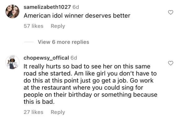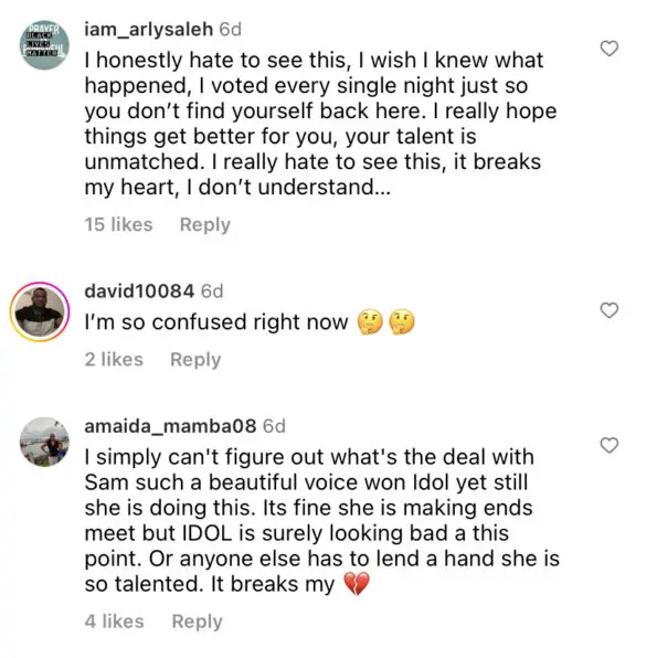Social media users have since flooded Sam’s comment section with reactions to the singer’s current status in life. Some sent their well wishes and many others expressed concern for Sam, stating that she deserves better as a winning contestant from the long-running reality show.
