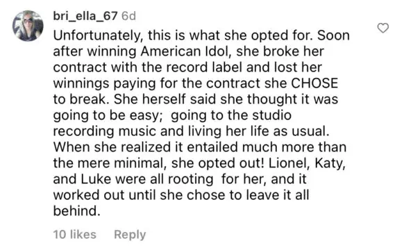 Earlier this month, in a since removed lengthy caption, Sam explained how she went from winning “American Idol” to, once again, singing in subway stations to make a living. She reportedly wrote,
