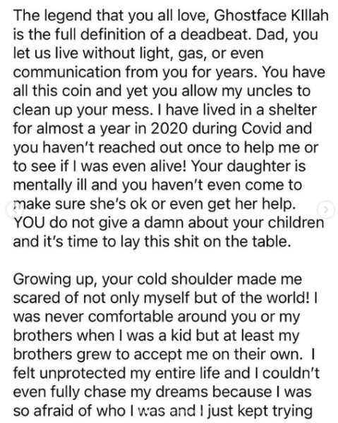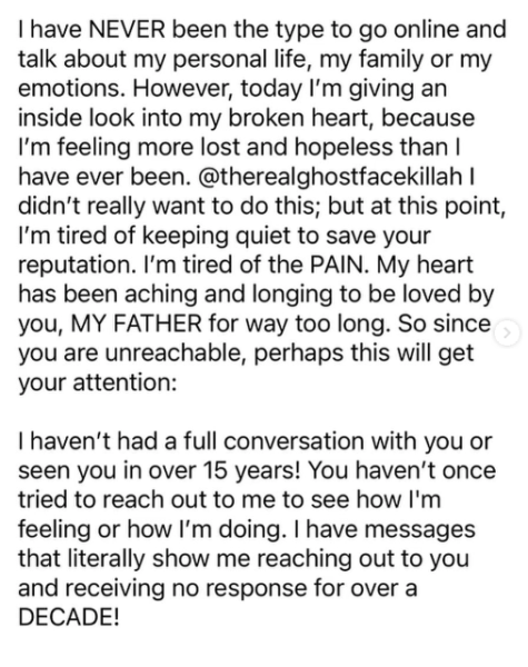 “I have NEVER been the type to go online and talk about my personal life, my family, or my emotions. However, today I’m giving an inside look into my broken heart, because I’m feeling more lost and hopeless than I have ever been. @therealghostfacekillah I didn’t really want to do this; but at this point, I’m tired of keeping quiet to save your reputation. I’m tired of the PAIN. My heart has been aching and longing to be loved by you, MY FATHER for way too long,”