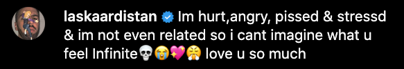 “I’m hurt, angry, pissed & stressed & im not even related so i cant imagine what u feel infinite love u so much”