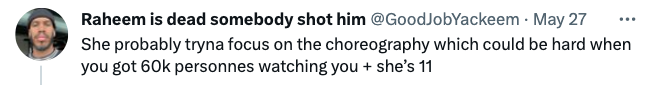 “She probably tryna focus on the choreography which could be hard when you got 60k personnes watching you + she’s 11”