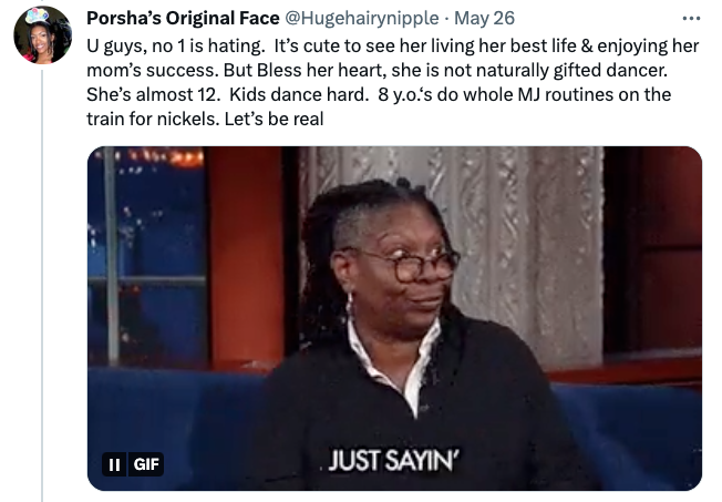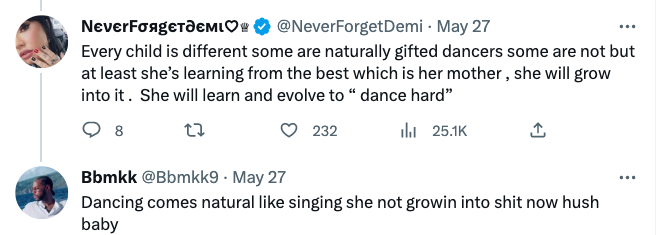 In another conversation, several users debated whether or not the young girl is “naturally gifted” as a dancer, with one person adamantly defending Blue Ivy’s potential.