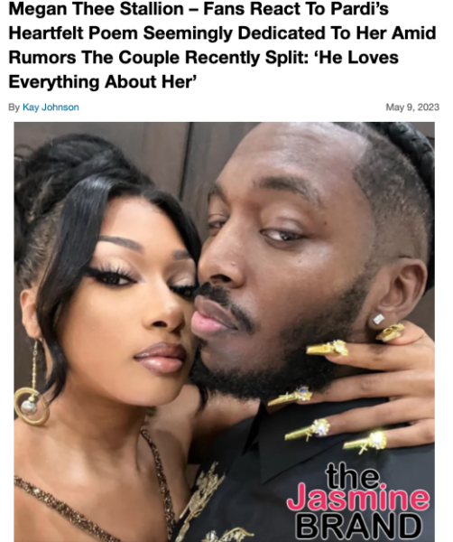 The question refers to Megan’s previous (ongoing) romance with fellow musician Pardi, aka, Pardison Fontaine, 33. It has been unclear whether or not the pair have called it quits completely. Megan and Pardi began dating back in February 2021. Amid several break-up rumors, they seemed to remain strong, even through the grueling trial of Megan and Tory Lanez. Earlier this month, the “Backin’ It Up” artist posted a heart-tugging video of himself performing live poetry, with his piece seemingly being dedicated to the “Savage” rapper.