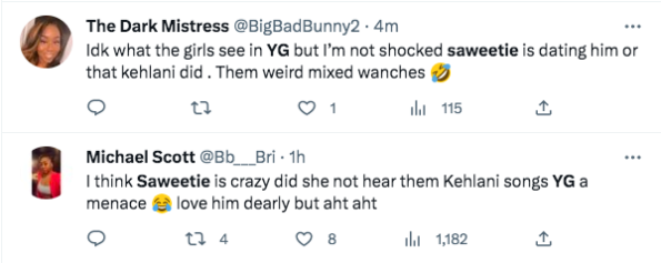 Others questioned how could Saweetie date YG when he’s the ex-boyfriend of her friend, Kehlani. You may recall that the Compton artist dated Kehlani back in 2019. However, they reportedly broke up after he cheated.