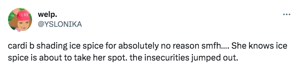 “cardi b shading ice spice for absolutely no reason smfh…. She knows ice spice is about to take her spot. the insecurities jumped out.”