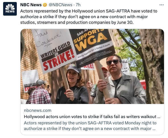 “Like the Writers Guild, SAG-AFTRA is also seeking limits on so-called generative AI used to replace acting work.”