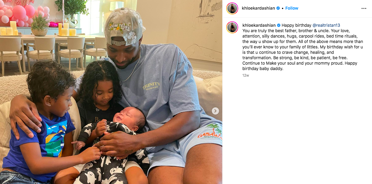“Happy birthday [Tristan Thompson], You are truly the best father, brother & uncle. Your love, attention, silly dances, hugs, carpool rides, bed time rituals, the way u show up for them.”