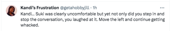 “Kandi… Suki was clearly uncomfortable but yet not only did you step in and stop the conversation, you laughed at it. Move the left and continue getting whacked.”