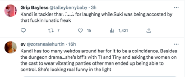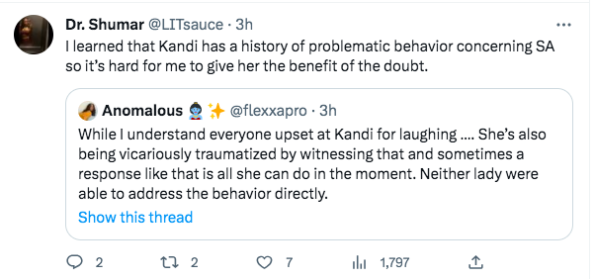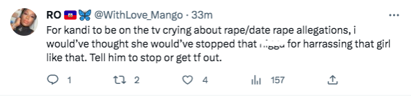 “For kandi to be on the tv crying about rape/date rape allegations, i would’ve thought she would’ve stopped that n*gga for harrassing that girl like that. Tell him to stop or get tf out.”