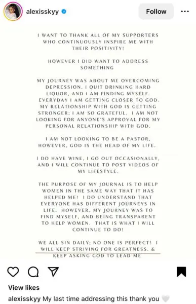 Alexis has spoken candidly about the changes she is making in her life and the transformation she has gone through. Last month, she addressed naysayers who were questioning her spiritual journey.