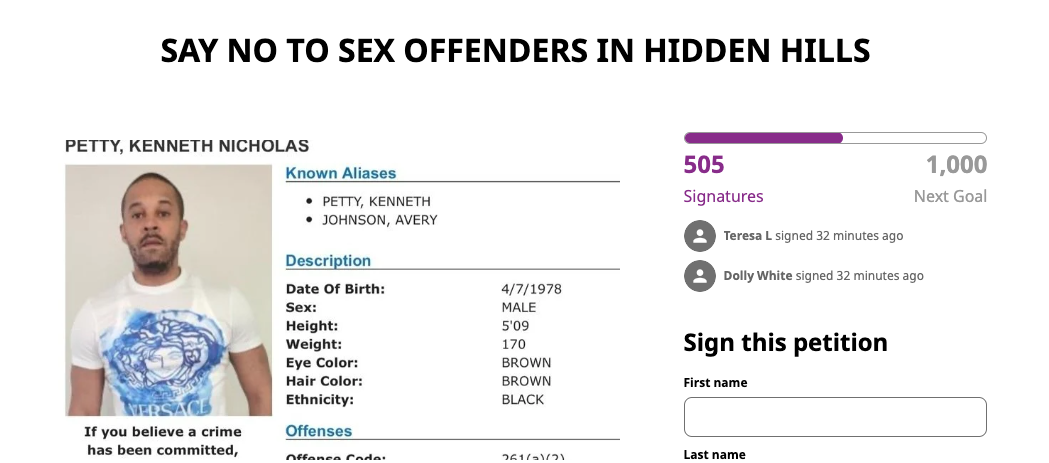 “The Petty couple moving in would lead to appraisal value of our homes to go DOWN due to safety concerns. It would lead to children and women being a target. We, the residents of Hidden Hills, must put our resident’s safety first. Don’t wait to receive a letter from the government saying a predator has moved in near you. DO NOT allow this dangerous sex offender to live near you, SHOW that you are against sex offenders in our Hidden Hills neighborhood!”