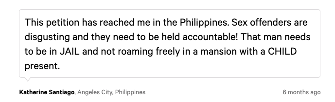 “This petition has reached me in the Philippines. Sex offenders are disgusting and they need to be held accountable! That man needs to be in JAIL and not roaming freely in a mansion with a CHILD present.”