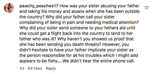 “How was your sister abusing your father and taking his money and assets when she has been outside the country? Why did your father call your sister complaining of being in pain and needing medical attention? Why did your sister send someone to your fathers aid until she could get a flight back into the country to tend to her father who was ill? Why haven’t you showed us proof that she has been sending you death threats? However, you didn’t hesitate to have your father implicate your sister as the person responsible for all his troubles which I might add appears to be fishy…..We didn’t hear the entire phone call.”